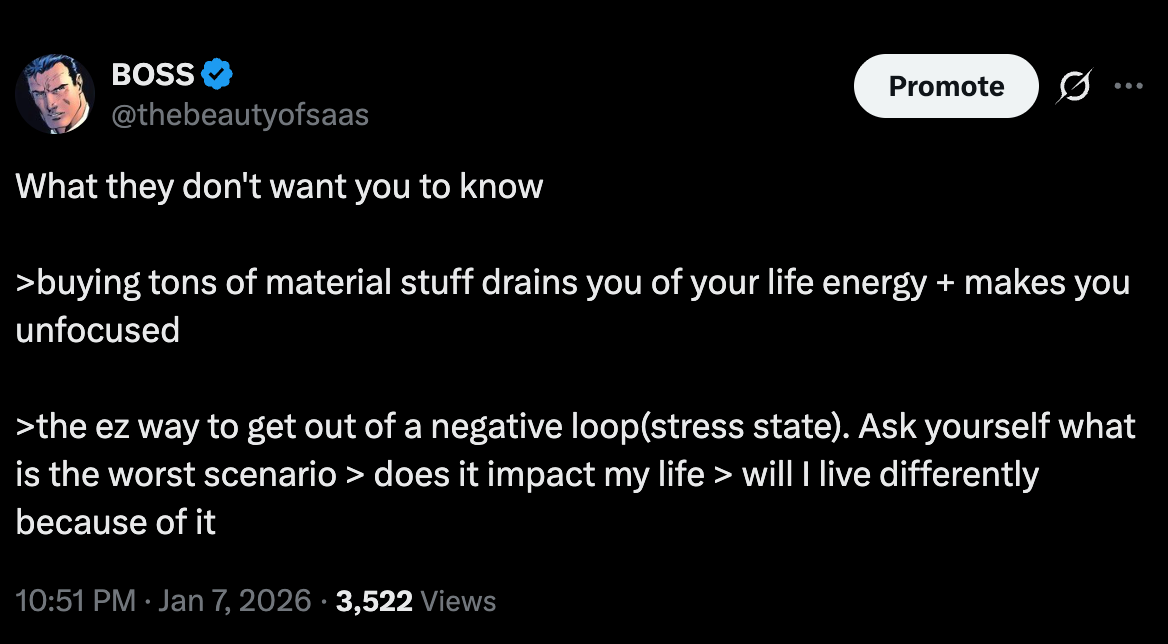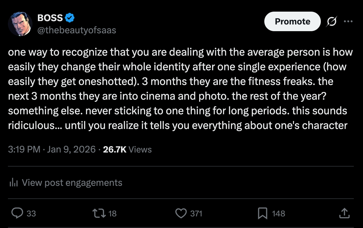 Taking time for granted (and waiting for the perfect moment): You do have time. Not to sell you the black pill or doomerism. But you absolutely can’t take that time for granted. Neither should you. When you take time for granted, you show a certain kind of disrespect for the life you are living. This doesn’t mean you have to be on the grind 24/7. It is a common lifestyle trap. This brings us to our next point. The perfect moment. The perfect moment doesn’t exist. What do average people always do? Wait for the perfect moment. One that will never come. When you think about it, it works hand in hand with someone who doesn’t respect time. Average people wait for the perfect time to start a business. Looking for a date to take care of their weight, or simply operate when _____ happens - that is when I will be ready to _____. That is not how life works. Everyone reading this should understand that it is another coping mechanism.