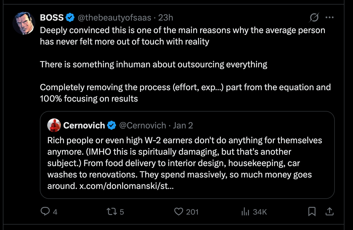 The examples above are just high-level basics most people can relate to and process. It is actually much deeper. The reason this fits into the article and how it impacts people is that they numb themselves to the point of becoming inhuman. Removing the process from their lives and focusing only on the results. Before you comment that this doesn’t make sense and that your favorite guru told you it is better to work 24/7 while things take care of themselves. No one can deny it. There is truth in that as well, especially when you are building something bigger. What that same guru won’t tell you is that there is a good chance that once he unplugs himself and detaches his identity from the work he is performing, or lies down in bed before sleeping. He is miserable. Much more so when it comes to offloading everything.