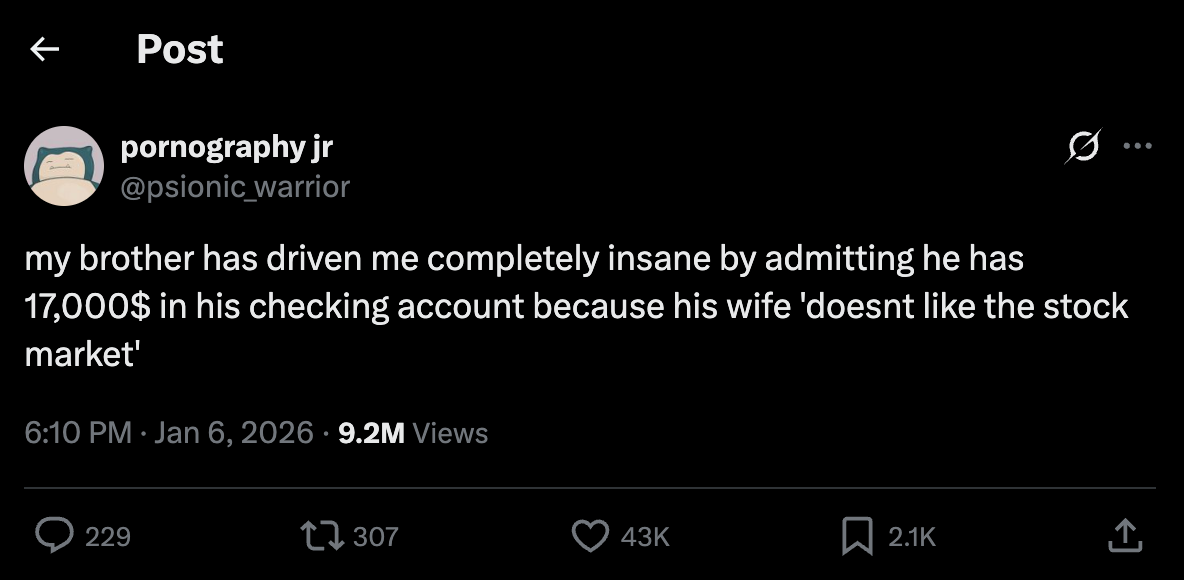 Zero idea about personal finance: Inflation. Compounding. Taxes. Debt. Mortgage. Retirement plan. If you ask people randomly to explain these basic financial concepts. You would be surprised how many would not be able to do it. Yet all of them directly affect your quality of life. Not just your quality of life. But also, how you should approach things and what kind of strategy you should use. Knowing that $5mil now won’t be worth the same in 20 years. Or that, instead of letting your money sit in a bank account and be eaten by inflation, it should be invested in an index fund, is not something the average person knows. If you ever find yourself in that type of situation, when it comes to this topic, and someone is unable to explain to you any of these… You already know the answer.
